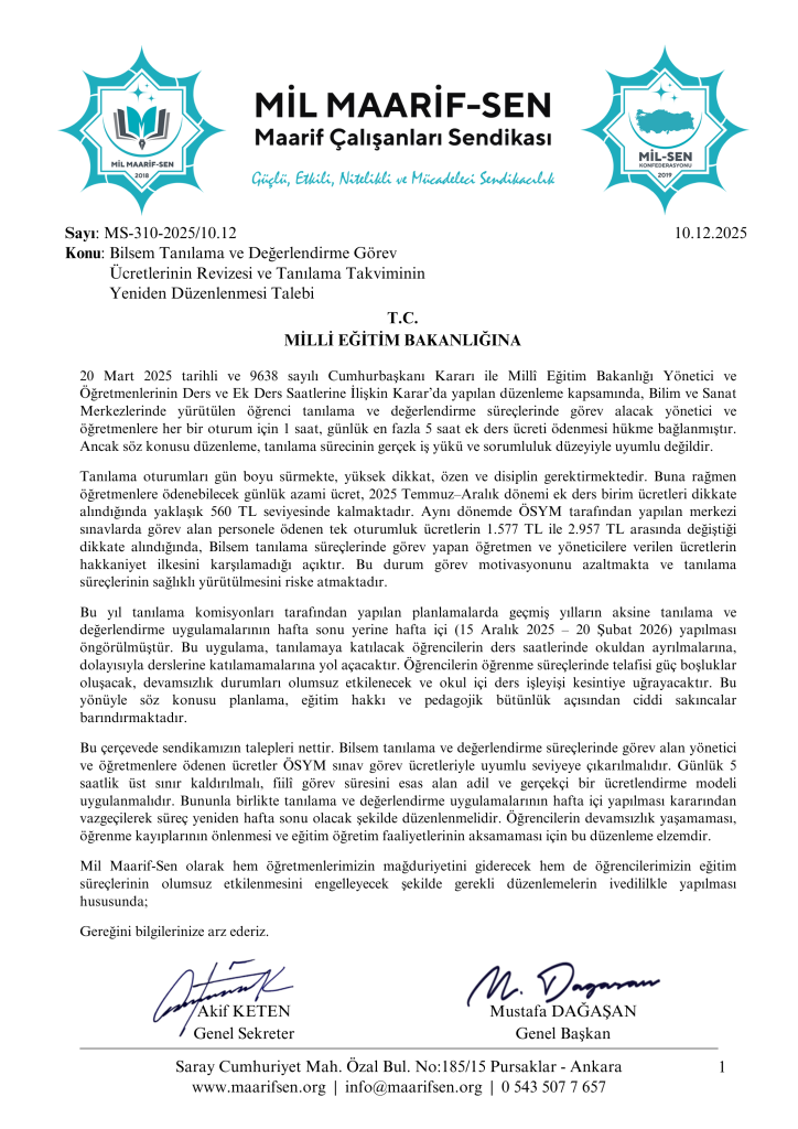 Bilsem tanılama görevlendirme ücretlerinin ÖSYM sınav ücretlerinin üçte biri seviyesinde kalması ve bu yıl tanılama sürecinin hafta içine alınması hem öğretmenleri hem öğrencileri mağdur ediyor. Maarif-Sen olarak, Millî Eğitim Bakanlığı’na ücretlerin artırılması ve takvimin yeniden düzenlenmesi yönünde resmî talepte bulunduk.