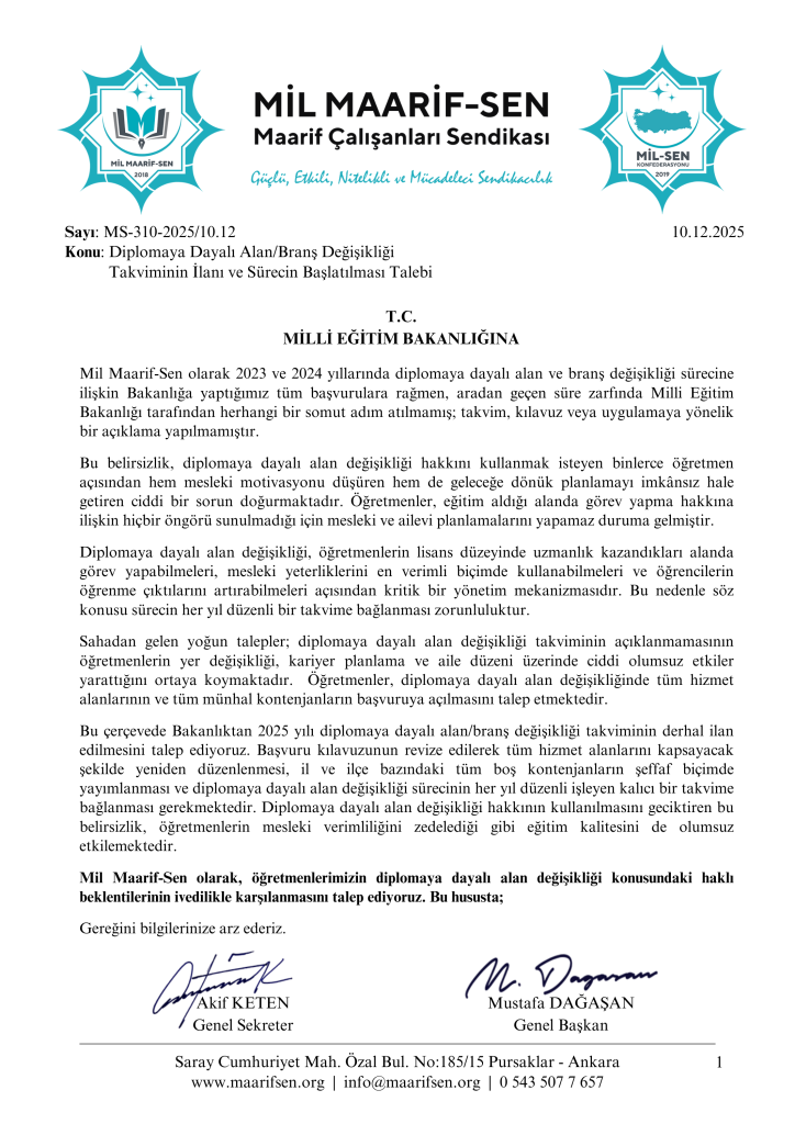 Mil Maarif-Sen olarak, 2023 ve 2024 yıllarında yapılan başvurulara rağmen diplomaya dayalı alan/branş değişikliği sürecinde hiçbir somut adım atılmaması üzerine,Milli Eğitim Bakanlığı’ndan diplomaya dayalı alan/branş değişikliği takviminin derhal açıklanmasını ve başvuru kılavuzunun revize edilmesini bir kez daha talep ettik.