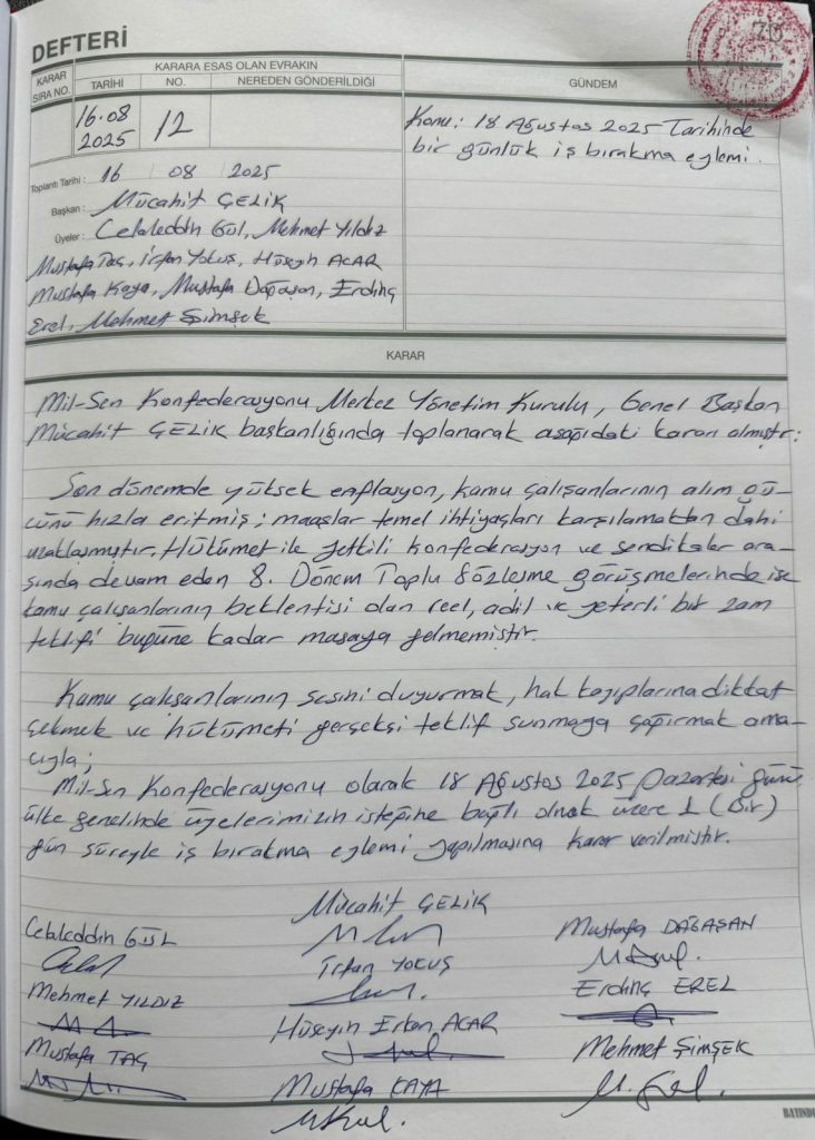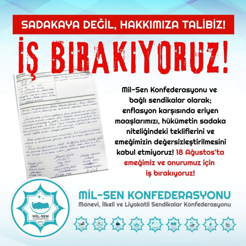 Mil-Sen Konfederasyonu ve bağlı sendikalar olarak; enflasyon karşısında eriyen maaşlarımızı, hükümetin sadaka niteliğindeki tekliflerini ve emeğimizin değersizleştirilmesini kabul etmiyoruz. 18 Ağustos’ta emeğimiz, ekmeğimiz ve onurumuz için iş bırakıyoruz!