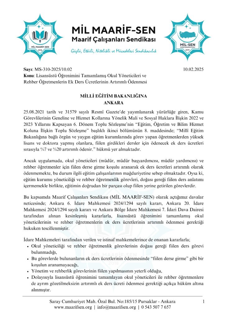 Bu kapsamda Maarif Çalışanları Sendikası (MİL MAARİF-SEN) olarak açtığımız davalar neticesinde; Ankara 6. İdare Mahkemesi 2024/1294 sayılı kararı, Ankara 20. İdare Mahkemesi 2024/1294 sayılı kararı ve Ankara Bölge İdare Mahkemesi 7. İdari Dava Dairesi tarafından alınan kesinleşmiş kararlarla, lisansüstü öğrenimini tamamlamış okul yöneticilerinin ve rehber öğretmenlerin ek ders ücretlerinin artırımlı ödenmesi gerektiği hukuken tescillenmiştir.