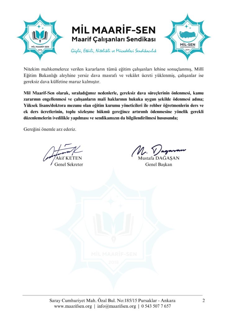 Mil Maarif-Sen olarak, sıraladığımız nedenlerle, gereksiz dava süreçlerinin önlenmesi, kamu zararının engellenmesi ve çalışanların mali haklarının hukuka uygun şekilde ödenmesi adına; Yüksek lisans/doktora mezunu olan eğitim kurumu yöneticileri ile rehber öğretmenlerin ders ve ek ders ücretlerinin, toplu sözleşme hükmü gereğince artırımlı ödenmesine yönelik gerekli düzenlemelerin ivedilikle yapılması ve sendikamızın da bilgilendirilmesi hususunda;