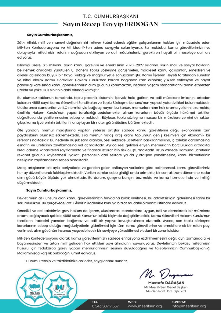 Mil-Sen Konfederasyonu Genel Başkan Yardımcısı ve Mil Maarif-Sen Genel Başkanı Mustafa Dağaşan, Cumhurbaşkanı Recep Tayyip Erdoğan’a bir mektup yazarak, 8. Dönem Toplu Sözleşme’nin kamu çalışanlarını mağdur ettiğini ve 4688 sayılı Kanun’un köklü bir şekilde değiştirilmesi gerektiğini vurguladı.