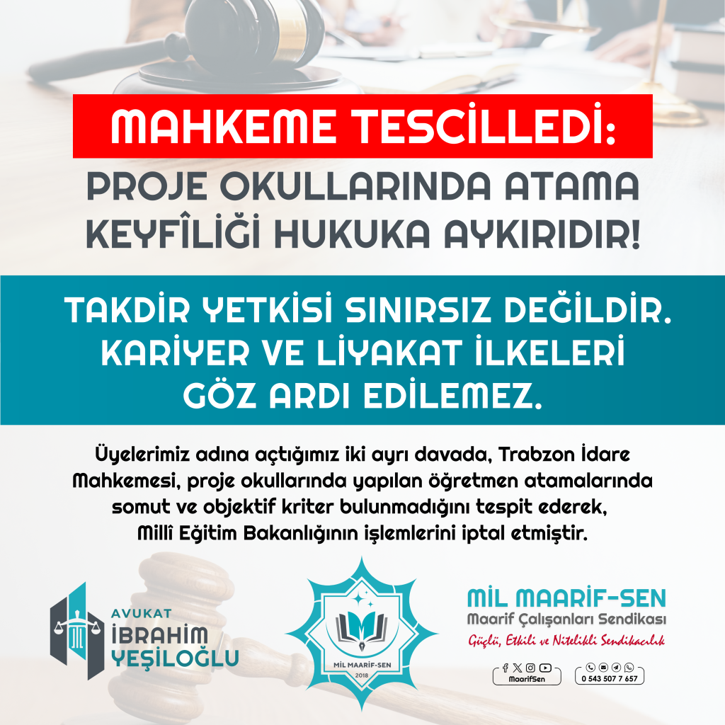 Mil Maarif-Sen olarak; proje okullarına ilişkin atama ve görevlendirme süreçlerinin, yargı kararları da dikkate alınarak açık, denetlenebilir ve objektif kriterlere dayalı bir yapıya kavuşturulması gerektiğini bir kez daha ifade ediyoruz. ‘Takdir yetkisi’ kavramı, keyfî uygulamaların gerekçesi hâline getirilemez.