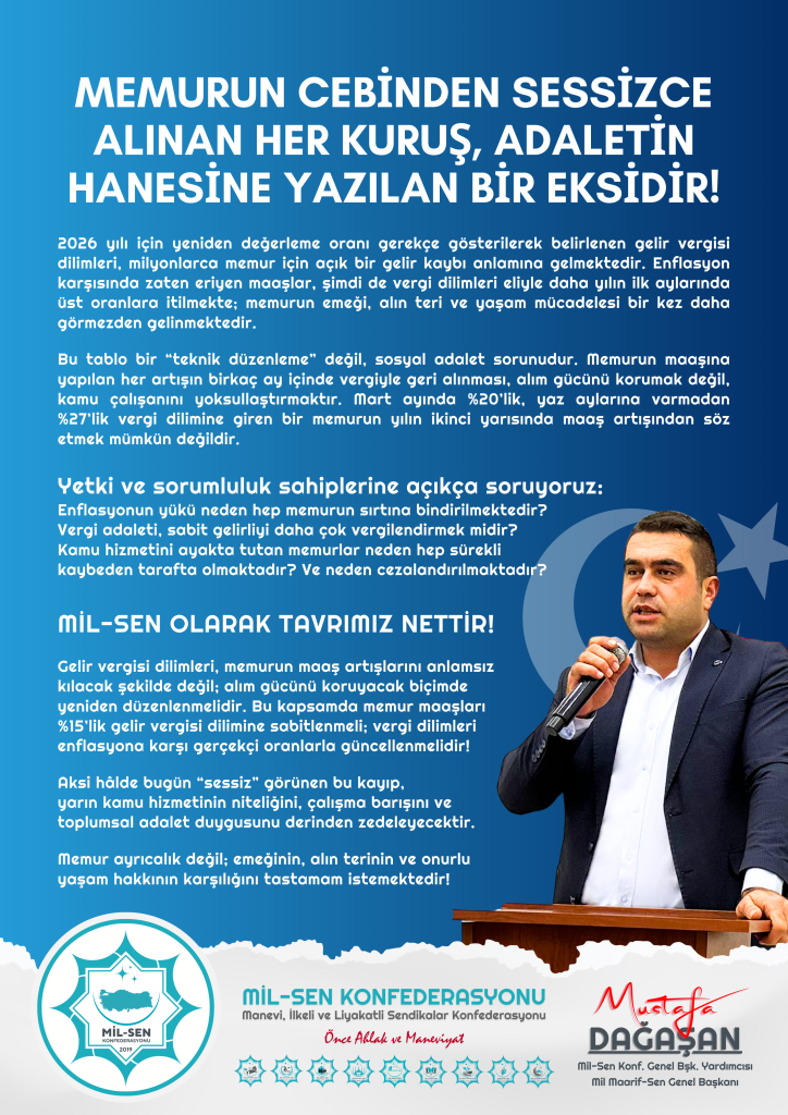 Genel Başkanımız Mustafa Dağaşan, 2026 yılı için belirlenen gelir vergisi dilimlerinin milyonlarca memuru daha yılın ilk aylarında üst oranlara ittiğini belirterek, enflasyon karşısında eriyen maaşların vergi dilimleri yoluyla geri alınmasının kabul edilemez olduğunu vurguladı. Dağaşan, memur maaşlarının %15’lik gelir vergisi dilimine sabitlenmesi çağrısında bulundu.