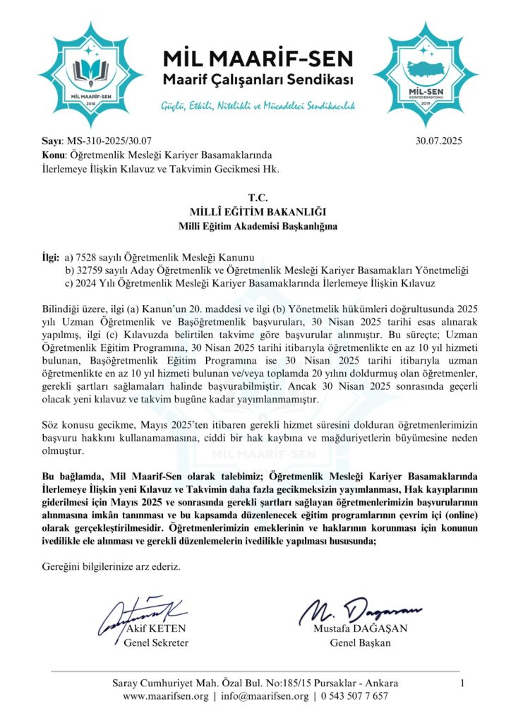 Mil Maarif-Sen Genel Merkezi, yaşanan bu gecikmenin Mayıs 2025 ve sonrasında gerekli hizmet süresini dolduran öğretmenlerimizin uzman öğretmenlik ve başöğretmenlik başvurusu yapamamalarına ve ciddi hak kayıplarına yol açtığını belirterek Milli Eğitim Bakanlığı’na resmi yazı ile çağrıda bulundu.