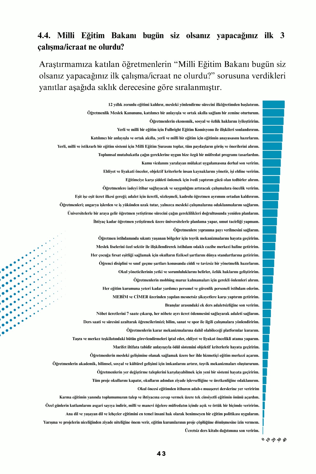 “Milli Eğitim Bakanı Bugün siz olsaydınız yapacağınız ilk 3 çalışma/icraat ne olurdu?” sorusuna öğretmenlerimizin verdiği cevapların bakanlık tarafından bugüne kadar yapılıp yapılmadığını gösteren tablo şu şekildedir:
