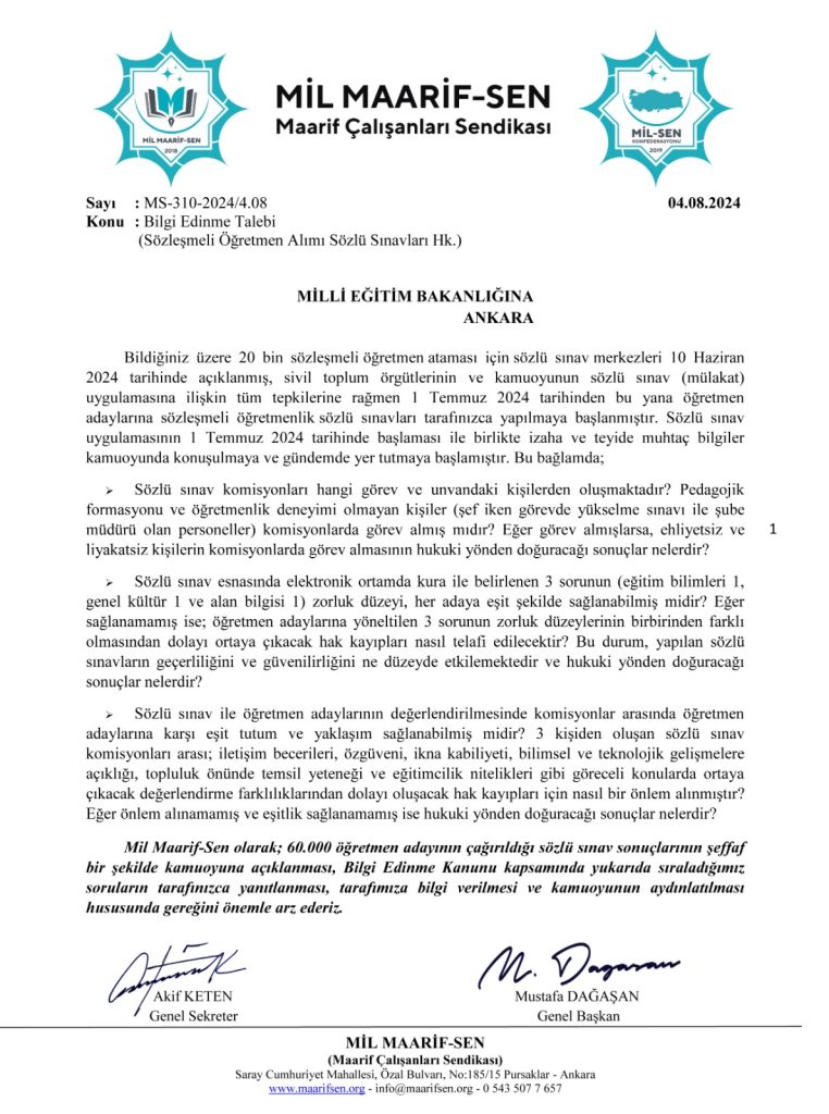 Bildiğiniz üzere 20 bin sözleşmeli öğretmen ataması için sözlü sınav merkezleri 10 Haziran 2024 tarihinde açıklanmış, sivil toplum örgütlerinin ve kamuoyunun sözlü sınav (mülakat) uygulamasına ilişkin tüm tepkilerine rağmen 1 Temmuz 2024 tarihinden bu yana öğretmen adaylarına sözleşmeli öğretmenlik sözlü sınavları tarafınızca yapılmaya başlanmıştır. Sözlü sınav uygulamasının 1 Temmuz 2024 tarihinde başlaması ile birlikte izaha ve teyide muhtaç bilgiler kamuoyunda konuşulmaya ve gündemde yer tutmaya başlamıştır. Bu bağlamda;